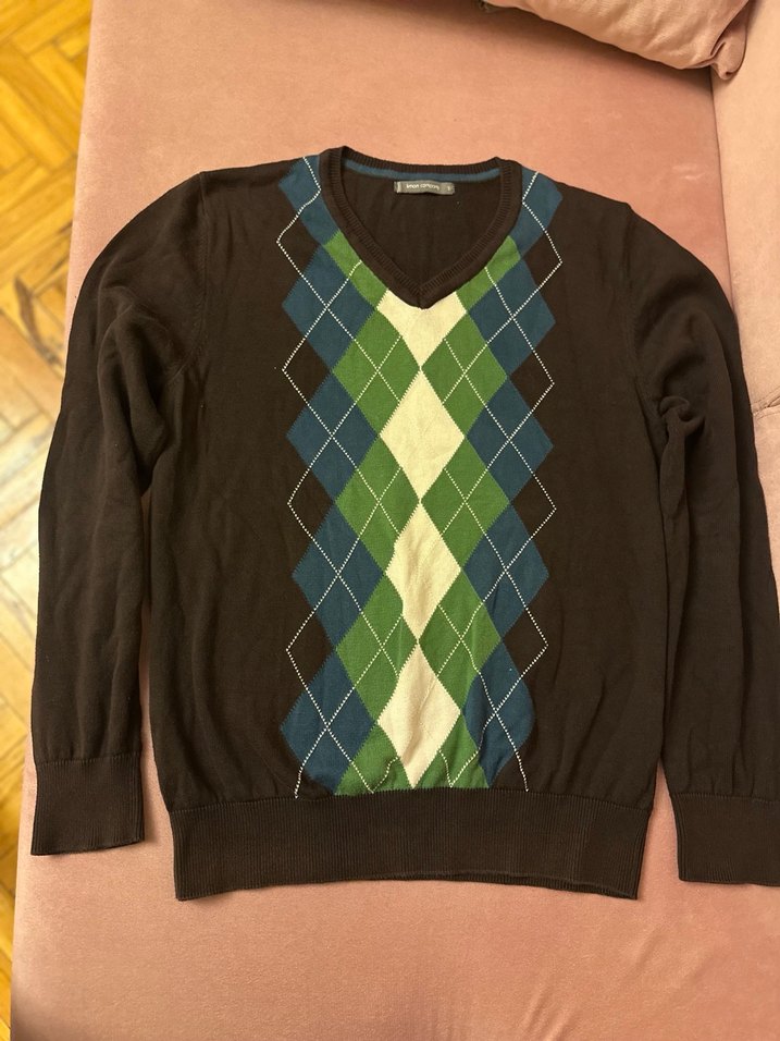V yaka, kahverengi örgü erkek kazak, önden renkli argyle desenli, rahat ve şık sokak stili için uygun. Ürün tertemiz sorunsuz