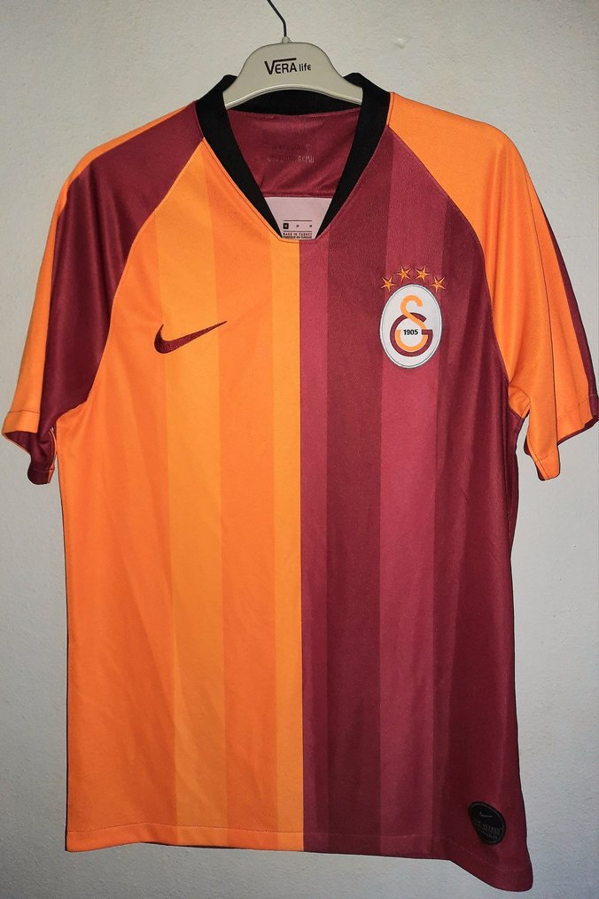 Erkekler için V yaka, kısa kollu, bol kesim Galatasaray forması. Düğmeli ve baskılı, koyu turuncu ve bordo renklerde. Günlük sokak stili için uygun, sentetik kumaştan yapılmıştır.