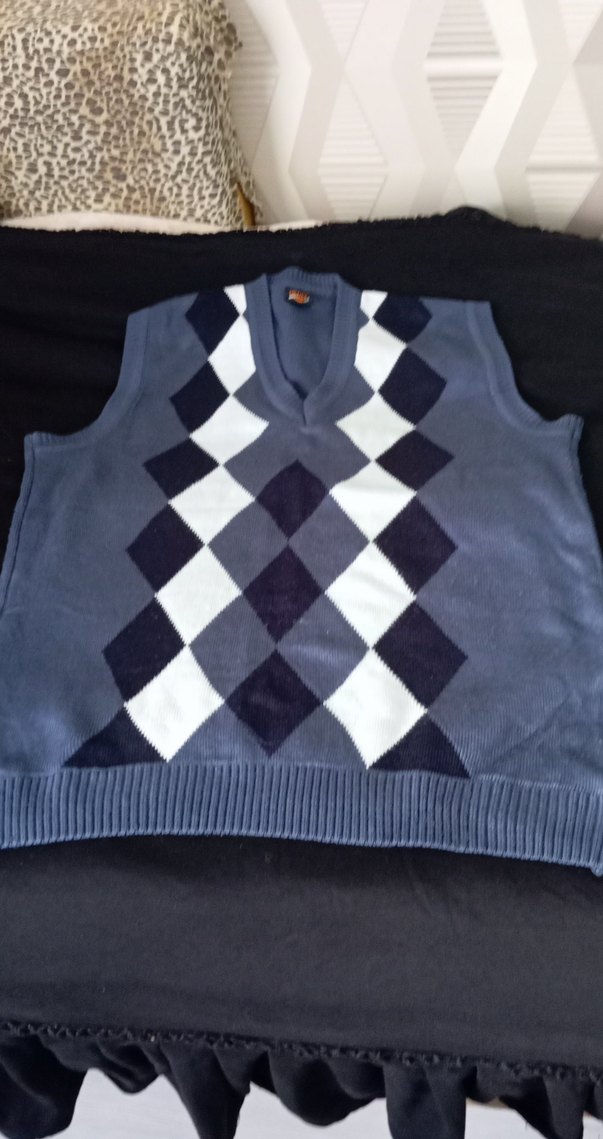Gri tonlarında baklava desenli, V yaka, triko, kolsuz süveter. Rahat kesimi ve normal boyu ile günlük sokak stiline uygundur.