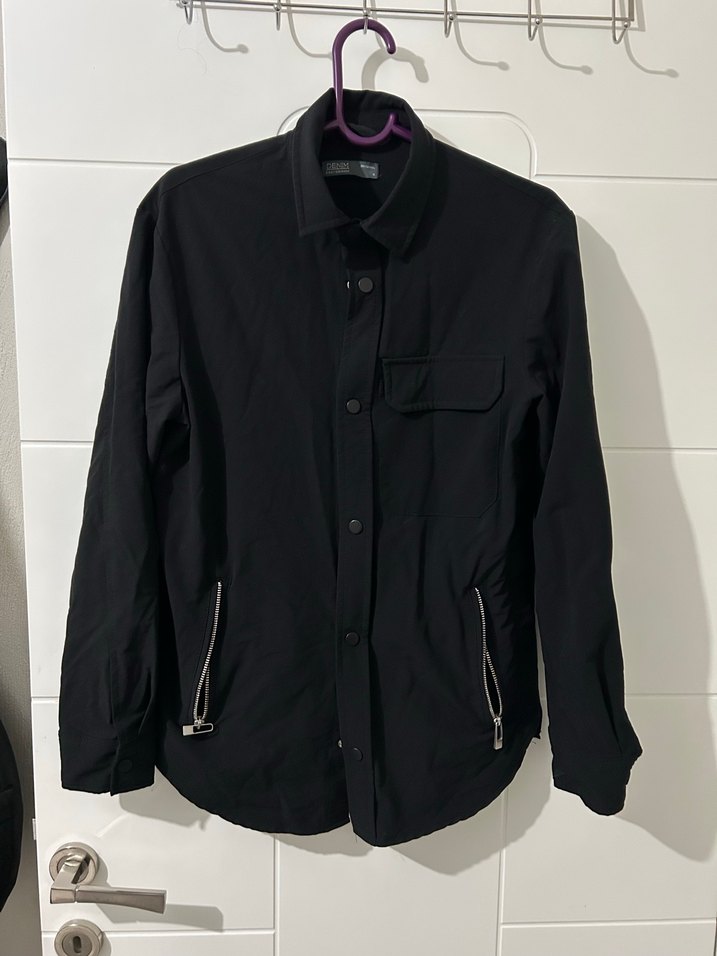 Bu erkek veya kadın siyah ceket, düğmeli ön ve uzun kolludur. Notlu yakalı, regular fit ve midi boydadır. Yanlarında fermuarlı cepler bulunur, sentetik kumaştandır. Tertemiz esneyen naylon tarzı kumaştır çıtçıtlı sorunsuz