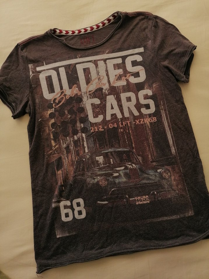 Erkek için deri malzemeden, bol kesim, bisiklet yakalı, kısa kollu tişört. Kahverengi-gri tonlarında, eski model araba baskılı, günlük kullanım için uygun.