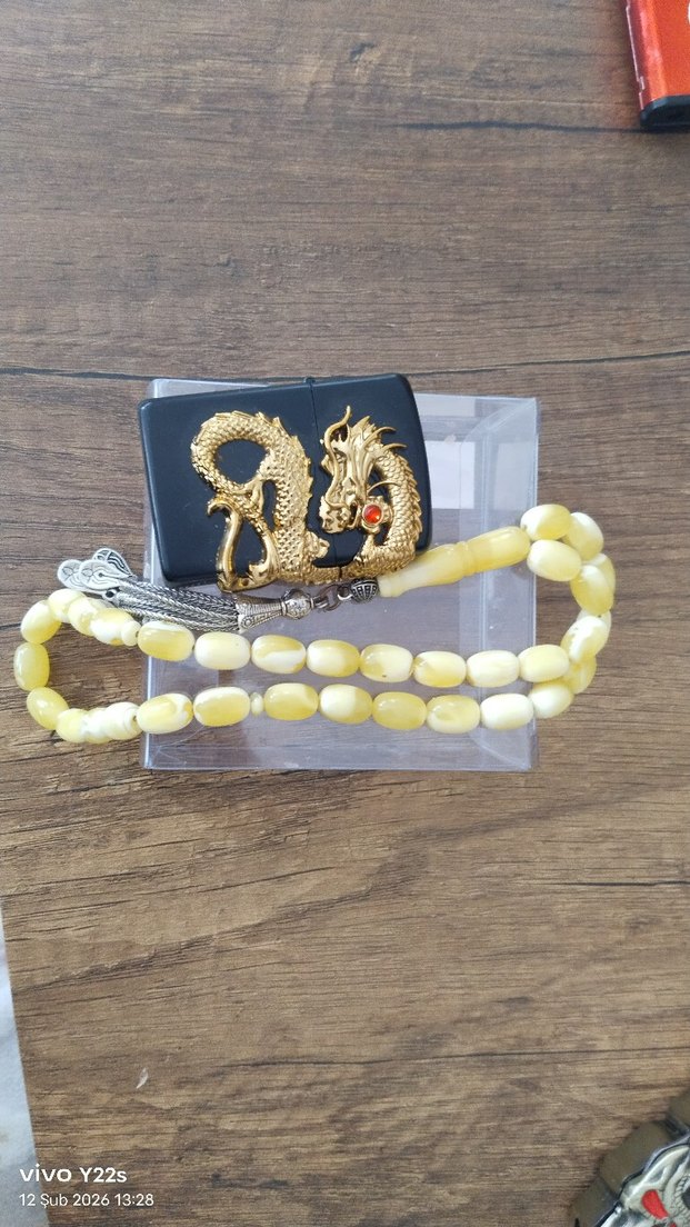 Erkekler için vintage bohem tarzda, koyu altın renkli ejderha figürlü tesbih. Açık sarı renkli, pürüzsüz boncuklar çakmak