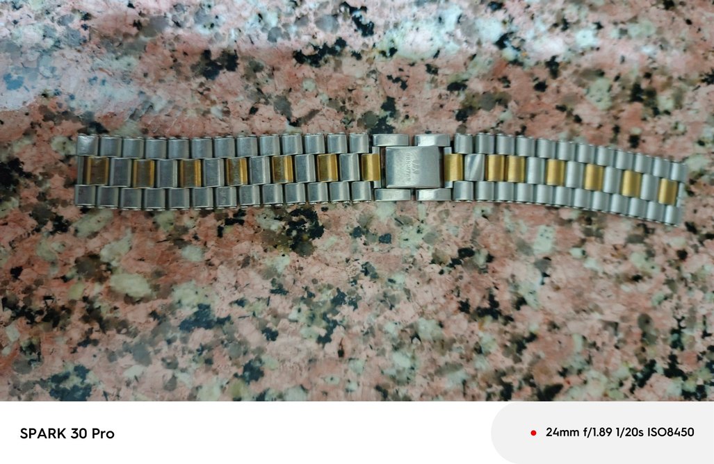 Erkeklere özel, gri ve altın renkli metalden yapılmış vintage tarzda saat kordonu. Klasik toka ile güvenli kullanım sağlar. ⌚