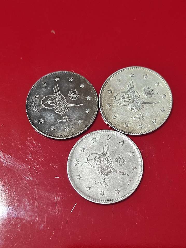 Kırmızı zemin üzerinde geleneksel sembollü, mütevazı tasarımlı üç adet vintage tarzı gri erkek rozet. 3 adet gümüş 2 kurus