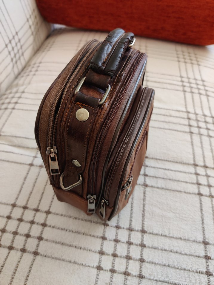 Diger markalı koyu kahverengi vintage erkek omuz çantası, çoklu fermuarlı bölmeler ve tokalı tutma sapı ile güvenli taşıma sağlar. Desensiz klasik tasarım. Aktif kullanıldı, son fermuarı değişti rengi biraz farklı ve fermuar tamir yapılması lazım