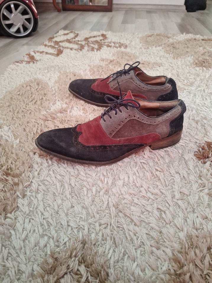Erkekler için vintage tarzda, bordo, gri ve siyah süet desenli klasik ayakkabılar. detaylarıyla günlük ve ofis kullanımına uygundur.