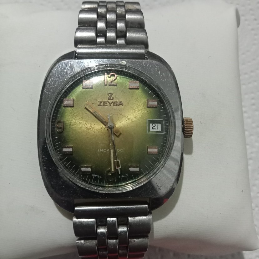Erkek vintage kol saatinde koyu haki kadran ve 3 konumunda tarih göstergesi bulunur. Metal bilezikli, ZEYSA markalı ve 21 numaralı kadrana sahiptir. ⌚