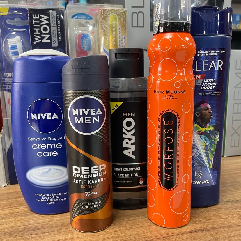 Nivea Men Deep Dimension deodorant, Arko Black Edition tıraş kolonyası ve Morfose ultra güçlü saç köpüğü içeren erkek vücut bakım seti.