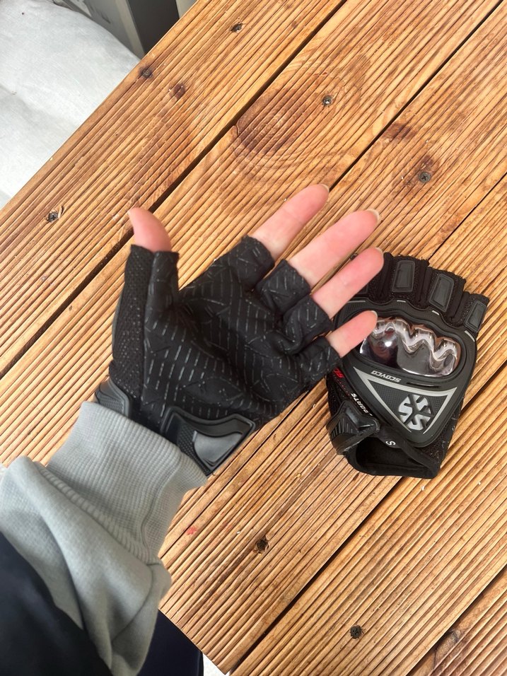 Siyah ve gri yarım parmak biker eldiven, baskılı desen ve koruyucu eklem tasarımıyla S beden.