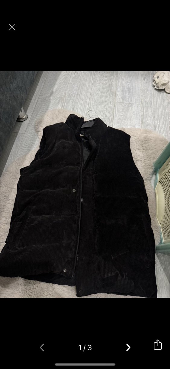 Siyah, kollu olmayan, kürklü detaylara sahip, yumuşak ve sıcak kumaştan yapılmış, yakalı ve vücuda oturan kesimli kadın yelek. Rahat sokak stili için uygundur. Hafif defosu var cep yakında