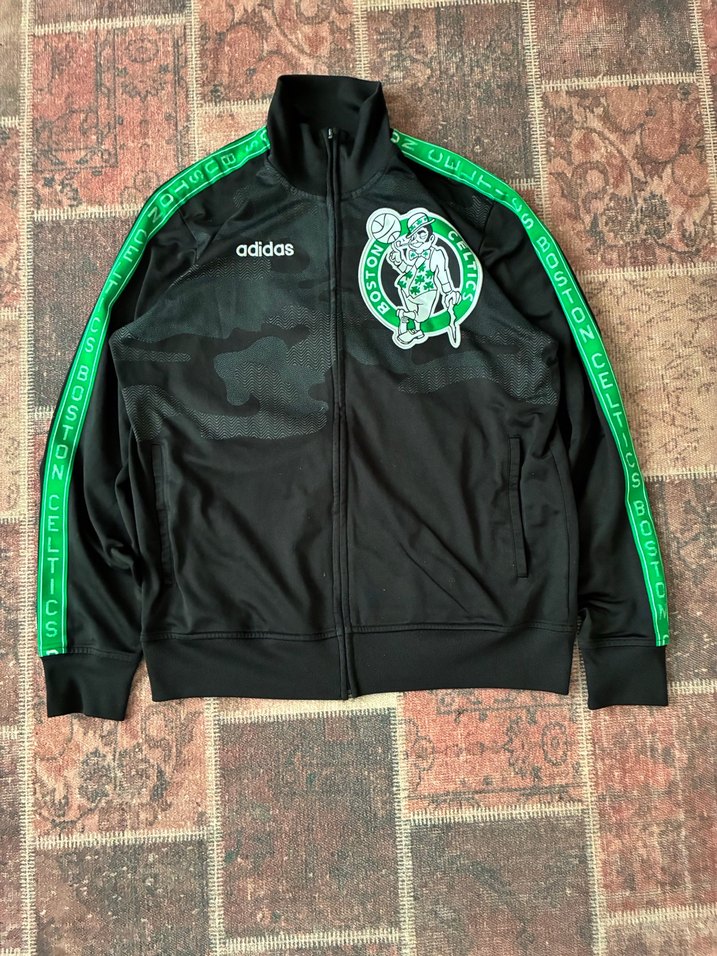 Fermuarlı, yüksek yakalı ve fitted kesim erkek ceketi. Yumuşak fleece kumaş, yeşil baskılı Boston Celtics ve adidas detaylarıyla.