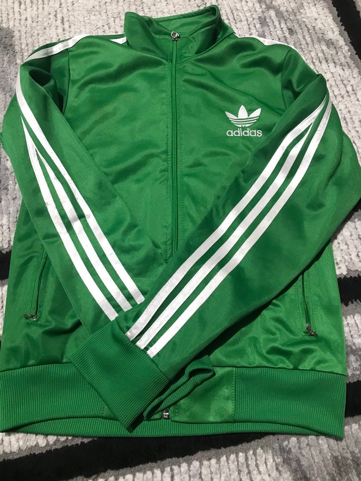 Fermuarlı, uzun kollu ve parlak yeşil sentetik kumaştan yapılmış Adidas erkek spor ceket. Yüksek yakalı ve beyaz şerit detaylı, günlük spor tarz için uygun.orijinal değil 10-11 yaşa uygundur