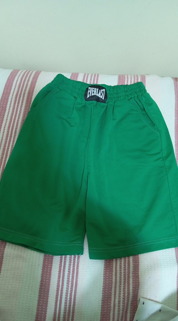 Yeşil renkli, kemerli ve bol kesim erkek şort. Sentetik kumaştan üretilmiş, renkli ve rahat sokak stili. Etiket üzerinde "ETERLAST" yazıyor.