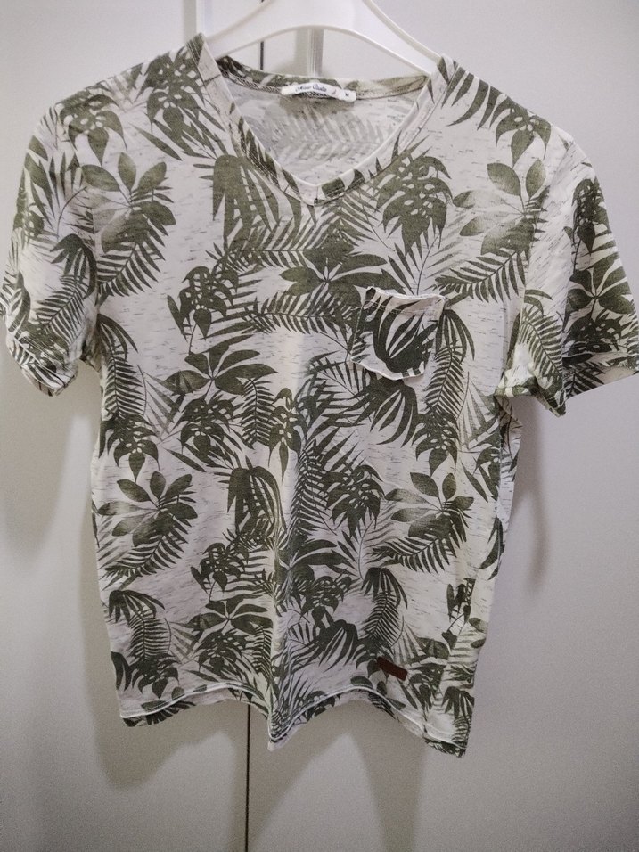 Erkek tişörtü, kısa kollu ve yuvarlak yaka kesimiyle gevşek bir uyum sunar. Yeşil ve gri tonlarda tropikal yaprak baskılı, sentetik kumaştan kısa boyda üretilmiştir.