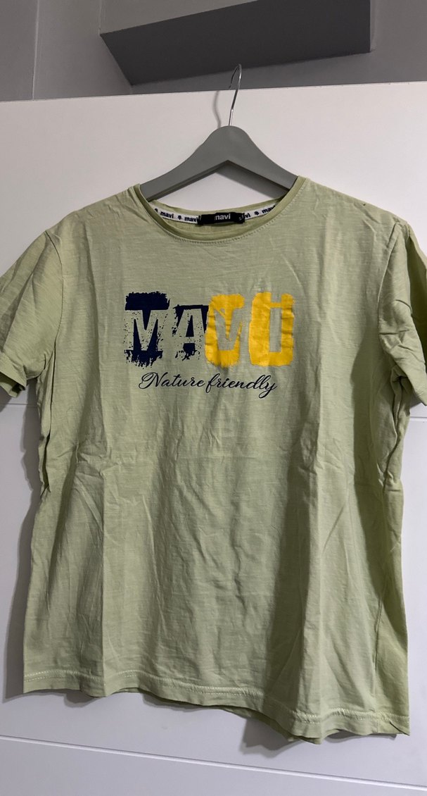 Pamuklu, pastel yeşil erkek tişörtü, rahat kesim, bisiklet yaka ve kısa kollu. Baskılı deseniyle şık ve rahat bir görünüm sunar.