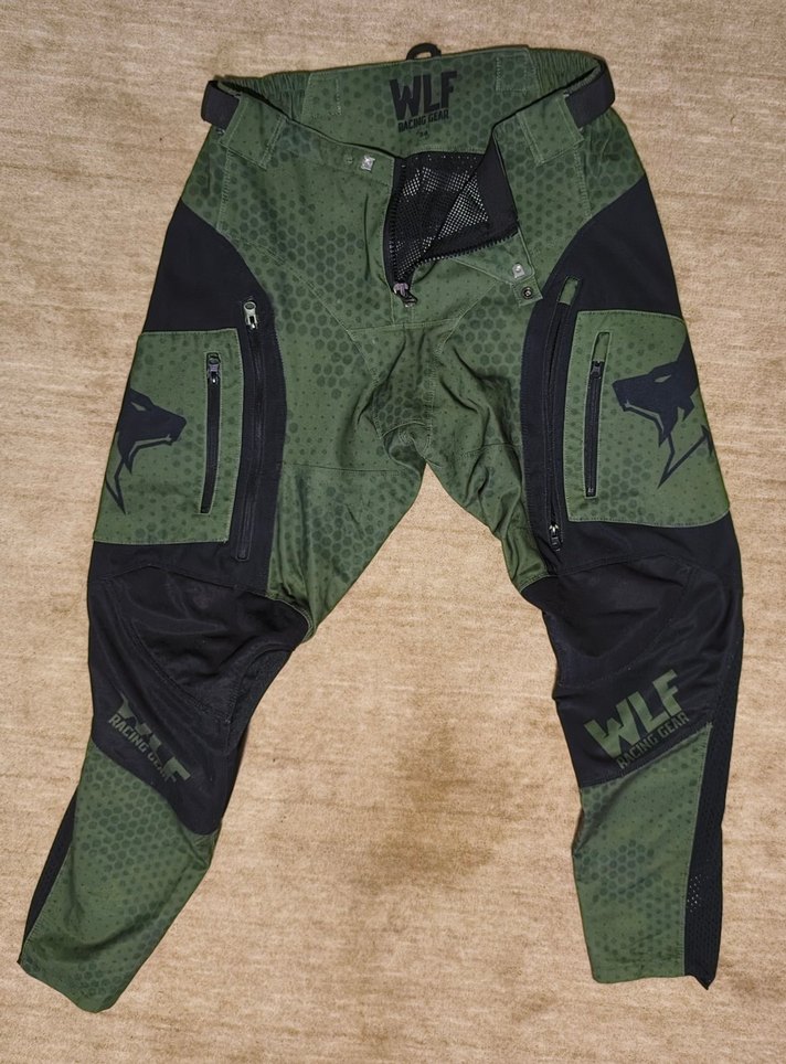 Fermuarlı cepleri ve dar kesimiyle yeşil biker tarzı erkek pantolon, sentetik kumaştan, outdoor aktiviteler için uygun. ️1 kez giyildi.