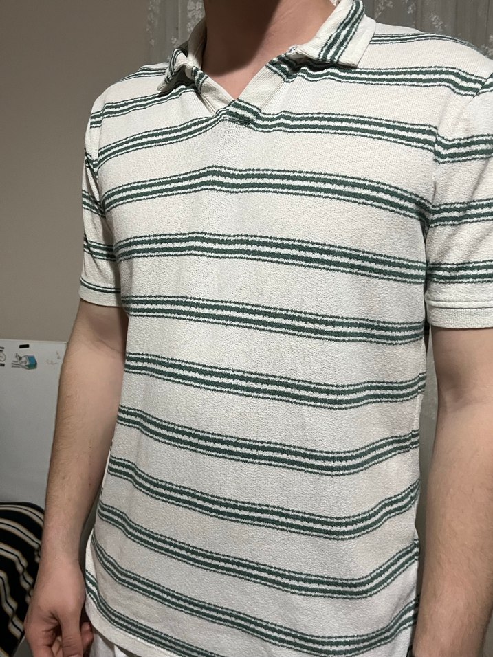 Gri çizgili beyaz kumaştan, yakalı ve kısa kollu, rahat kesim erkek polo tişörtü. Günlük sokak stili için uygundur.