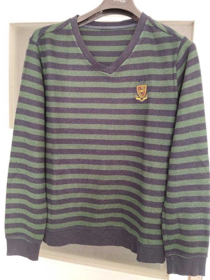 Erkekler için uzun kollu, V yaka, koyu yeşil ve siyah çizgili triko kazak. Rahat kesim, gündelik ve sokak stili için uygun, göğüste küçük amblem bulunur. ölçü,55/64/62