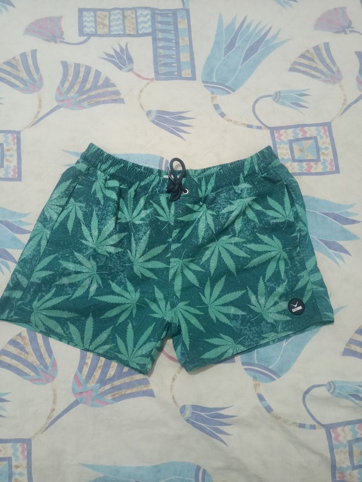 Erkekler için yeşil yaprak desenli, bol kesim, deniz şortu, mini şort. Düğmeli ve renkli tie-dye sokak tarzına uygun, içindeki astar rahatsızlık verdiği için kesilmiştir , plaj için ideal.