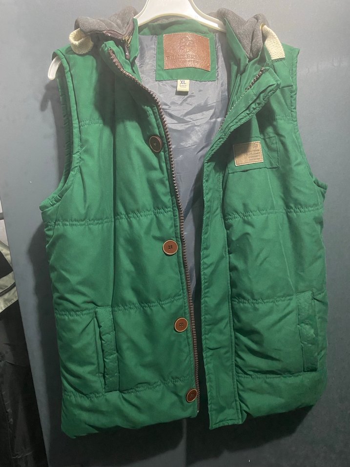 Düğmeli, yeşil renkli, kolsuz ve notalı yaka detaylı erkek yeleği. Sokak modasına uygun, rahat ve sıcak kumaştan üretilmiştir. Kapşon fermuarlu çıkabilir