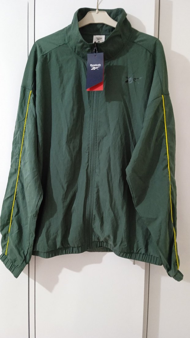 Erkek yeşil yağmurluk, fermuarlı ve uzun kollu, sarı çizgili detaylıdır. Gevşek kesim ve normal boydadır, sentetik kumaştan yapılmıştır. ️ iki koltuk arası 62 cmdir ceplidir