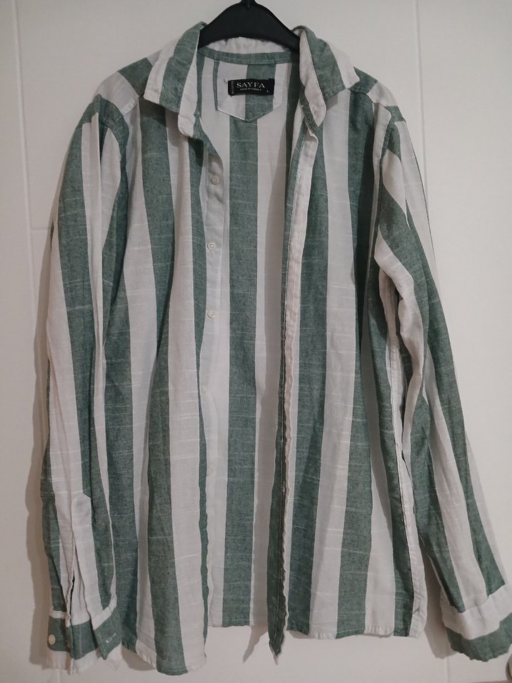 Uzun kollu, keten kumaştan yapılmış, yeşil ve gri çizgili erkek gömleği. Düğmeli ve notched lapel yakaya sahip, rahat kesim, günlük sokak stili için uygun.