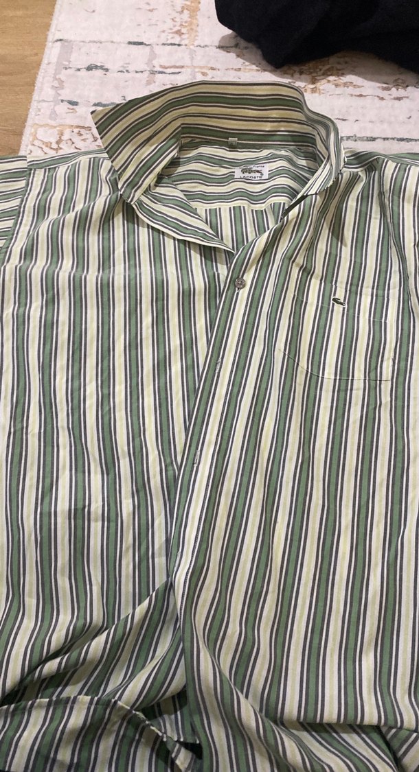 Düğmeli, yakalı ve kısa kollu erkek gömleği. Yeşil ve gri çizgili, regular fit, günlük ve sokak stiline uygun.