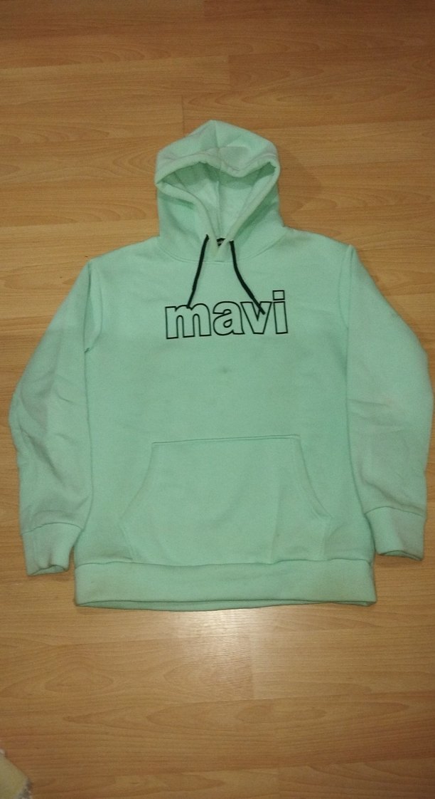 erkek için rahat kesimli, pastel yeşil renkli ve 'mavi' baskılı kapüşonlu sweatshirt. Yumuşak, örme kumaştan üretilmiş, uzun kollu ve normal boyda, günlük kullanım ve sokak stili için uygundur. L BEDEN