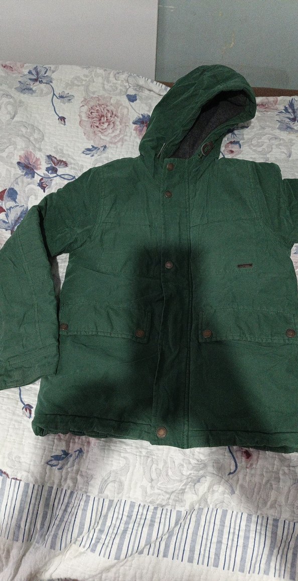 Yeşil kapüşonlu, düğmeli erkek ceket; uzun kollu, bol kesim, koyu renkli ve rahat kumaştan, günlük kullanım için uygundur.