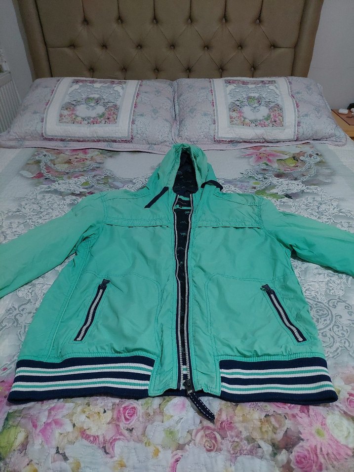 Erkek yeşil kapüşonlu rüzgarlık, fermuarlı ön ve ceplere, bol kesime ve çizgili eteğe sahiptir. Günlük kullanıma uygundur. ️omuzlarda ve şapkasında ufak renk açılma var fotoğrafta paylaştım