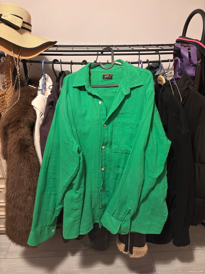 Erkekler için yeşil keten kumaştan, salaş kesim ve uzun kollu, düğmeli gömlek. Rahat ve günlük sokak stiline uygun. Bir kez giyildi kusuru yok Xxl beden