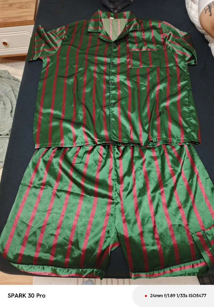 erkekler için parlak yeşil ve kırmızı çizgili, kısa kollu, mini uzunlukta, vintage tarzı rahat pijama takımı.
