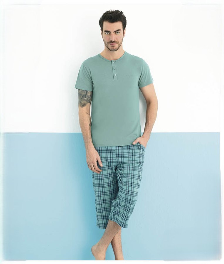Diger erkek pijama takımı, pastel yeşil kısa kollu üst ve ekose desenli şortlardan oluşur. Rahat ve salaş kesim, bisiklet yaka ile tamamlanır.