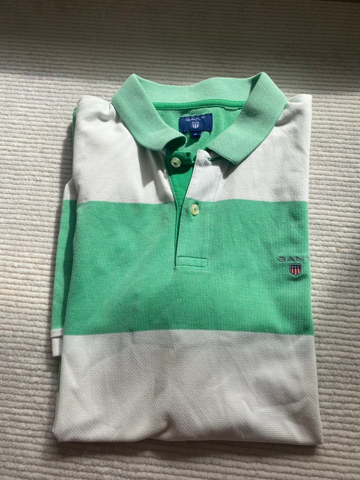 Pamuk kumaştan, kısa kollu, düğmeli yakalı ve pastel yeşil-beyaz blok renkli, sokak modasına uygun erkek polo tişört. Gant orjinal ürün