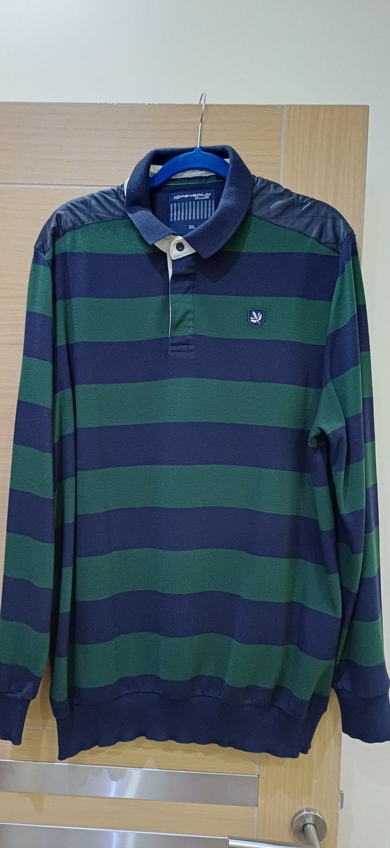 Erkek uzun kollu, düğmeli yakalı polo tişört, koyu yeşil ve lacivert çizgili, rahat kesim, yumuşak ve sıcak kumaştan, günlük sokak stili için uygun.