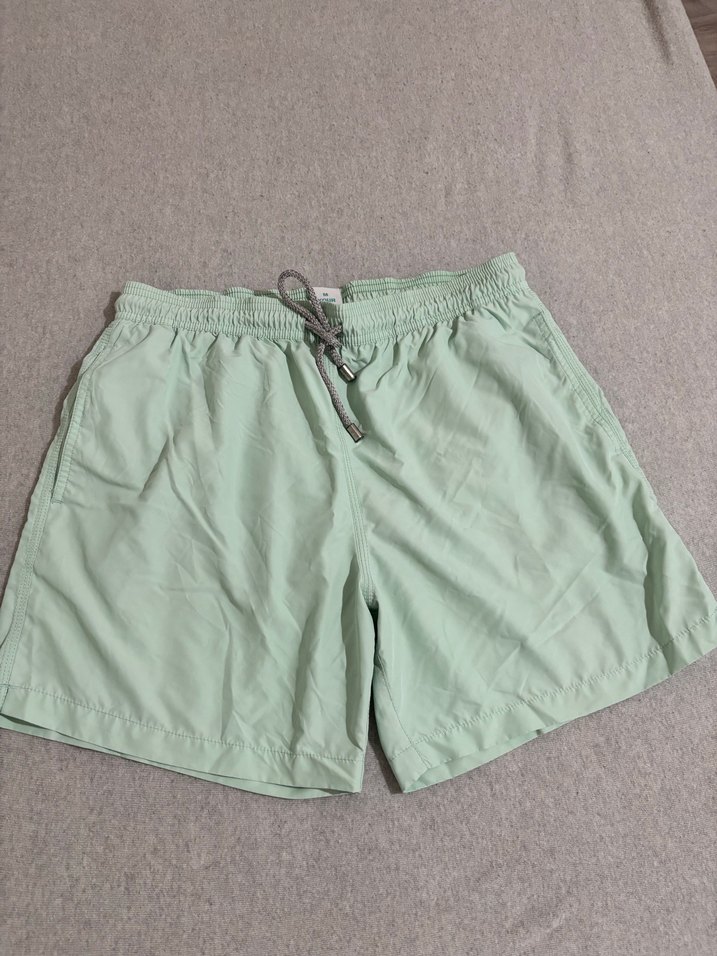 Erkekler için pastel yeşil renkte, rahat kesim ve mini boy mayo, plajda sade ve sokak modasına uygun.