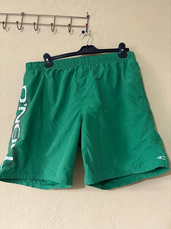 Erkekler için bol kesim, parlak yeşil renkte, desen içermeyen mini şort mayo. Plaj ve günlük spor tarzına uygundur.