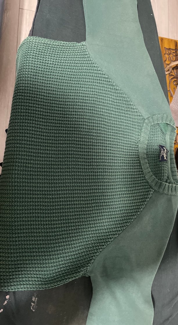 Erkek yeşil örme kazak, bisiklet yaka ve uzun kolludur. Sentetik kumaştan üretilmiş olup, sokak stiline uygun, sade ve koyu renklidir.