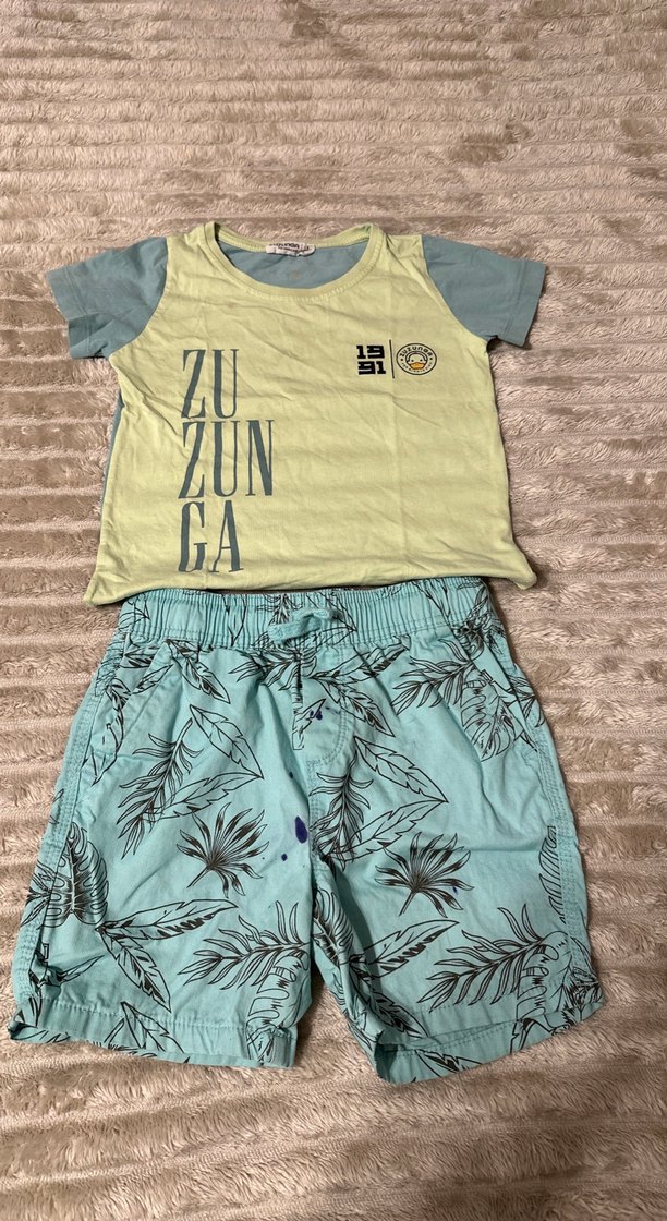 Yeşil pamuklu kısa kollu baskılı tişört ve yaprak desenli, fermuarlı cepli pastel yeşil şort takımı.