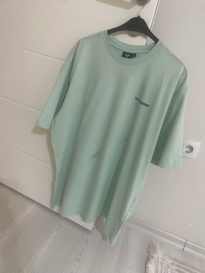 Pamuklu, kısa kollu, yuvarlak yaka, rahat kesim erkek yeşil pastel tişört. Minimal baskılı desenle günlük sokak tarzına uygun.