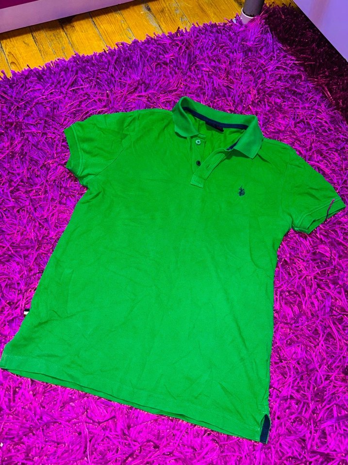Kısa kollu, yakalı, yeşil erkek polo tişört. Sentetik kumaştan, rahat kesim ve gündelik tarzda, parti için uygun.