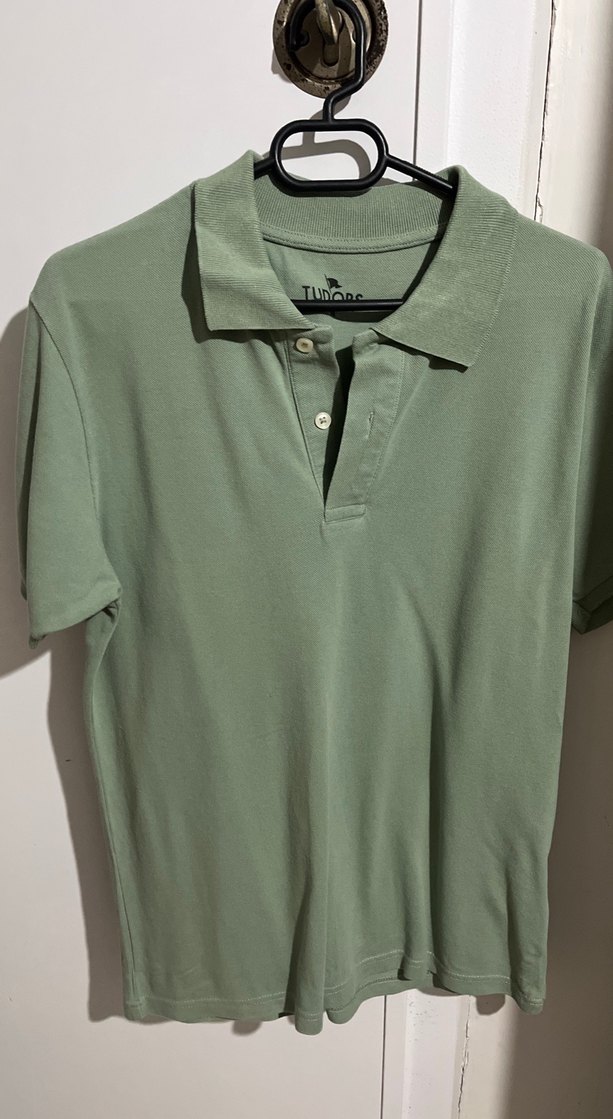 Pamuk kumaştan yapılmış, pastel yeşil renkli, kolyeli yaka ve kısa kollu, bol kesim erkek polo tişört. Günlük rahat sokak stili için uygundur.