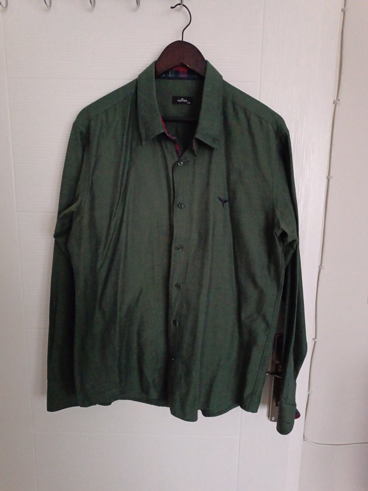 Erkek yeşil gömlek, uzun kollu, çentikli yaka ve düğmeli ön detaylara sahiptir. Normal kesim, sentetik kumaştan, ofis için uygundur.
