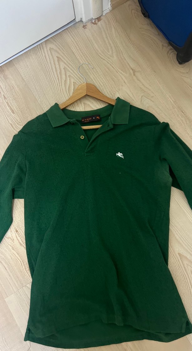 Erkekler için yeşil parlak renkte, uzun kollu ve yakalı, yumuşak ve sıcak kumaştan yapılmış, vücuda oturan polo tişört. Günlük rahat kullanım için şık ve sade.