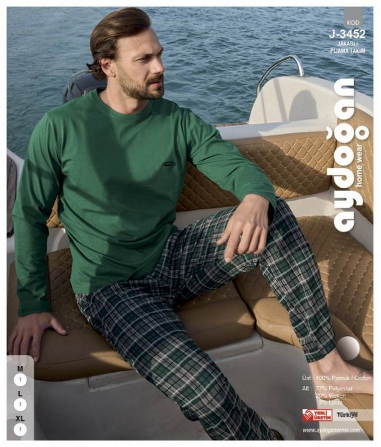 Erkekler için salaş kesim, koyu yeşil uzun kollu üst ve ekose desenli midi boy pantolonlu rahat pijama takımı.