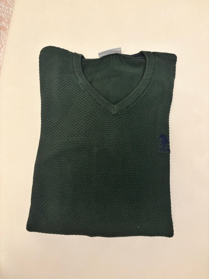 Bu erkek kazak, uzun kollu ve yeşil, hafif parlak triko kumaştan yapılmıştır. V yaka ve normal boyda olup, günlük sokak giyimi için uygundur.