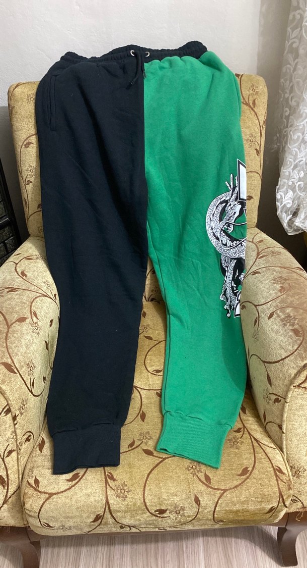 bol kesim, koyu yeşil ve siyah renk bloklu yılan baskılı eşofman altı. Sentetik kumaştan, fermuarlı ceplerle, sokak stili