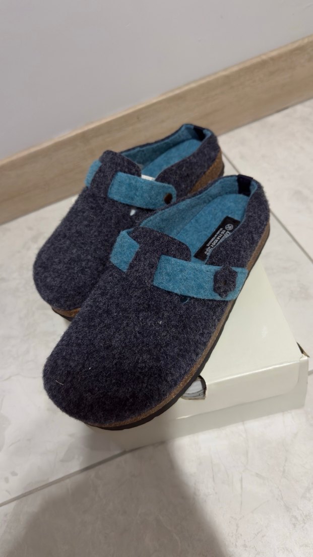 Kadın için yünlü, mavi ve gri tonlarında tokalı, klasik ve desensiz terlikler.