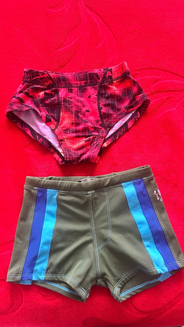 İki adet erkek yüzme şortu; biri canlı kırmızı, diğeri yeşil-mavi şeritli, elastik bel bantlı.