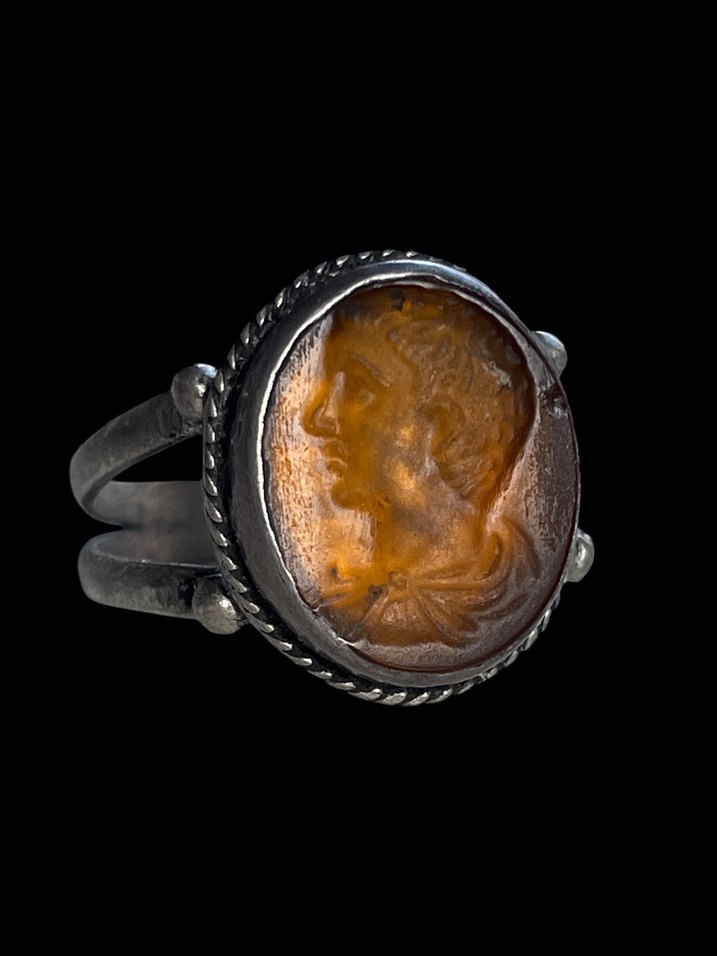 Bu erkek yüzüğü, koyu bej renkli antik görünümlü cameoya sahip vintage tasarımıyla dikkat çekiyor. Metal bantta dokulu detaylar bulunuyor.